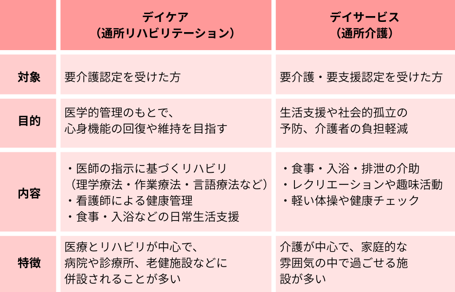このように、デイケアとデイサービスは、それぞれ目的や提供するケアが異なります。